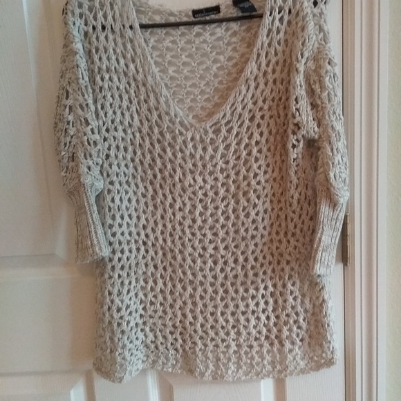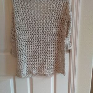 Beige crocheted top with gold metallic threading. 3/4 sleeves. Loose fitting.