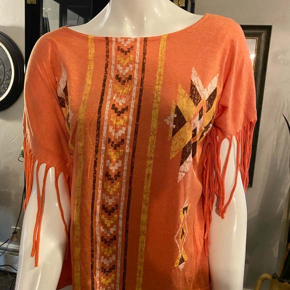 Orange , with yellow and brown stripes with like poncho style lock with fringes going done the sleeve .