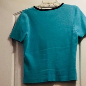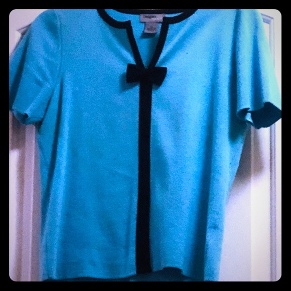 Hardly worn, may need a slight iron o back side of sweater top, short sleeved solis color black trim with cute bow!! Very beautiful blue! Gently worn no flaws!