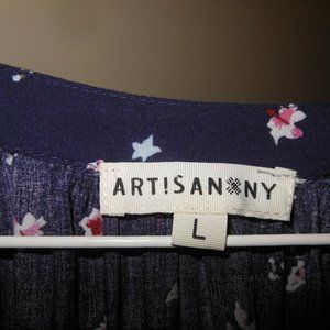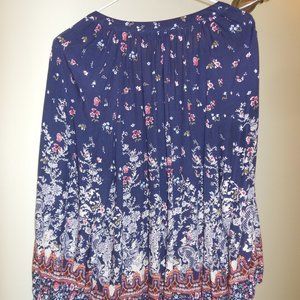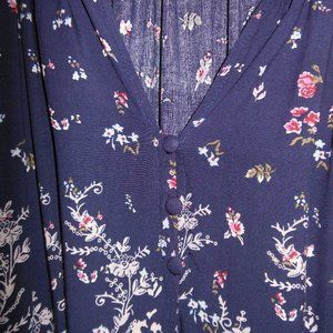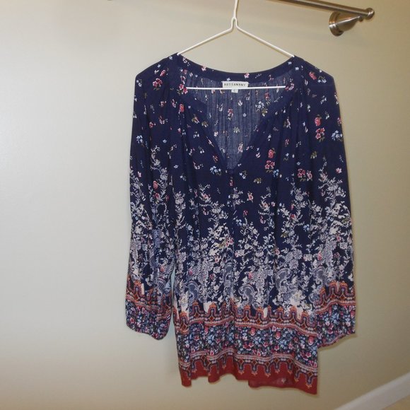 This shirt is in excellent condition and goes great with jeans! It is navy blue with a floral pattern that compliments a border along the bottom of shirt and the 3/4 length sleeves. It is v-shaped with 3 buttons at the neckline. It is a size large but fits more like a medium. This shirt is made of 100% rayon.