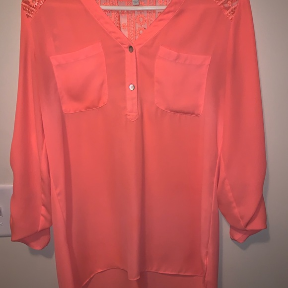 Beautiful silk like material tunic top with lace design on the top and sleeves that can be either down or rolled up and buttoned. Does wrinkle really ever. Great condition