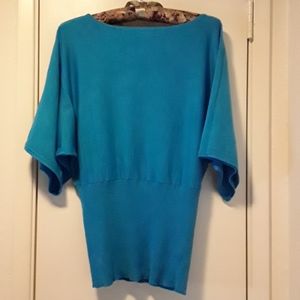 Nylon/Rayon 23" long, bottom stretch band 9" top of band 14" wide bottom of band 10". Neckline to bottom of sleeve 14", armpit to armpit 18". Small brass colored half beads across neckline.