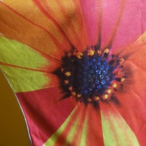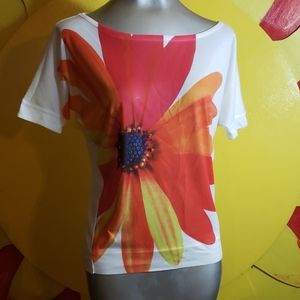 Polyester top with short sleeves and a giant flower on front.The feel of cotton,soft and cool.A really beautiful summer shirt!!