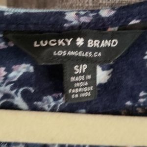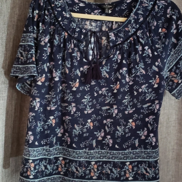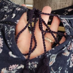Multicolor floral print mostly blue with hints of lavendar and peach flowers. Tassle tied scooped neckline. Loose bell short sleeves that drape on your arms. Worn once and in excellent condition.