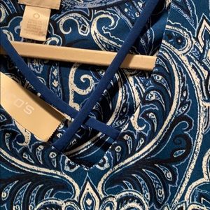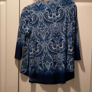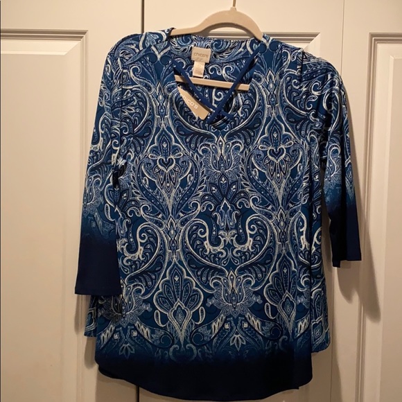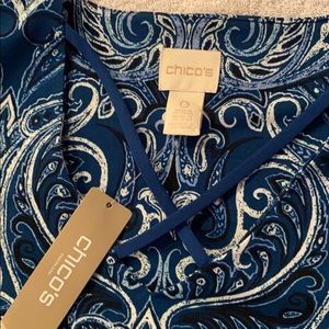 Beautiful long sleeve top❤️. Paisley print yet more of a teal than blue. Very pretty and comfortable! The hem of the top and sleeves go solid dark. The criss-cross on top adds flair. Chico’s new.