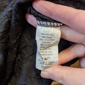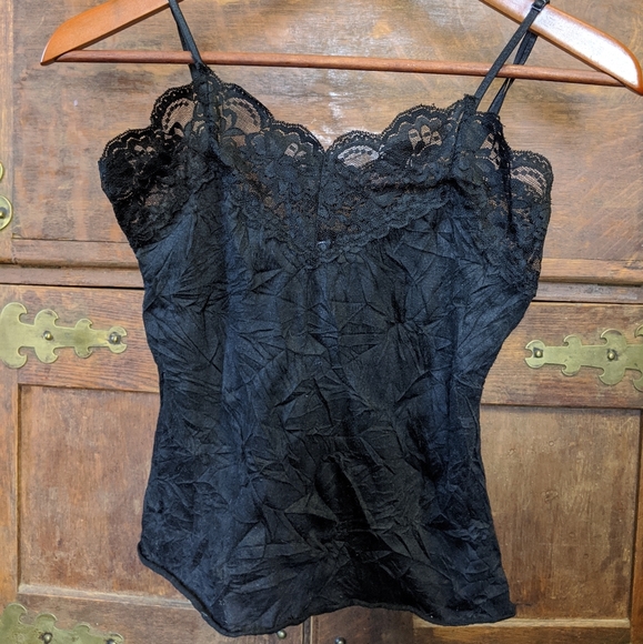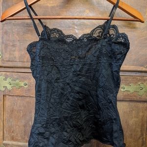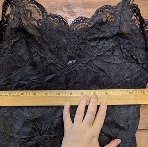 Black strappy top with lace neckline. Made by Charlotte Russe. It has a cool wrinkled texture that doesn't wash out. The straps are adjustable.
