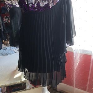 Black sheer overlay pleated one shoulder top with attached wing type sheer 3/4 sleeve.