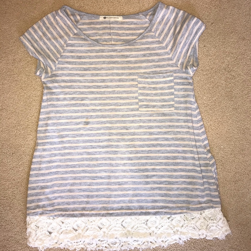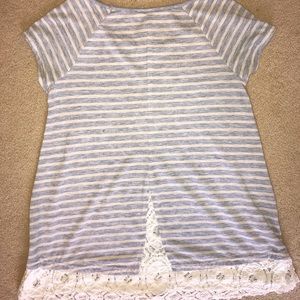 Gray and tan striped top with lace on the bottom and a small split in the back
