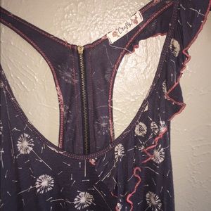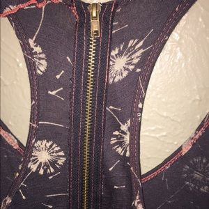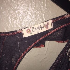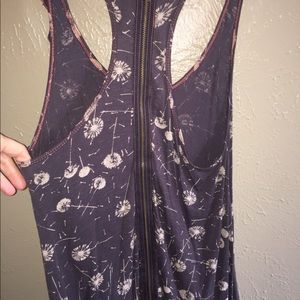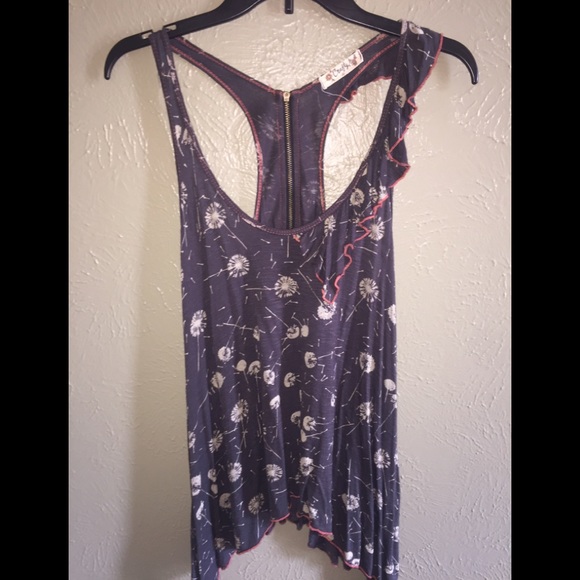 Super cute top ! Has a zipper in back . 26” long in middle. 31” long on sides . Armpit to armpit is 17” . 100% rayon . Has some stretch to it . Good condition