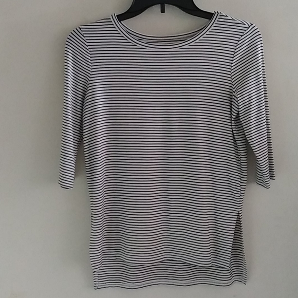 White and black striped, mid length sleeve, top. Comfortable and stylish. Like new.