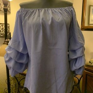 Strapless, off shoulder perfect summer top, subtle blue & white stripes, puffy sleeves, light weight fabric. Summertime fun paired with jeans or tapered pants, or whatever you desire. Sexy, classy to sport out for drinks with the girls, or on a great first date, or maybe a day of shopping and a bite to eat. HOT!