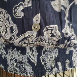 Floral print, short sleeved with elastic at bottom. No tags but I never wore it. Like new!