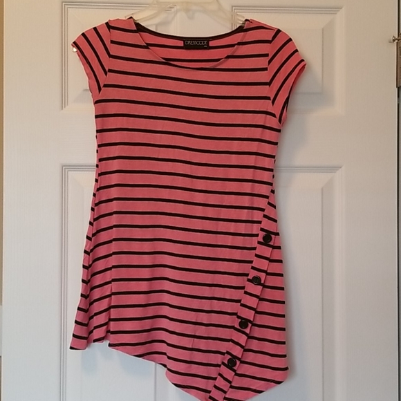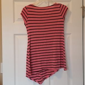 Cute long top with asymmetrical hem and bitton accent on front. Worn 1 time