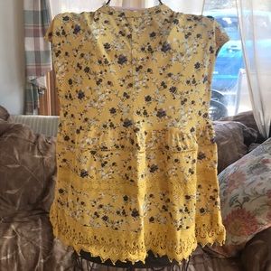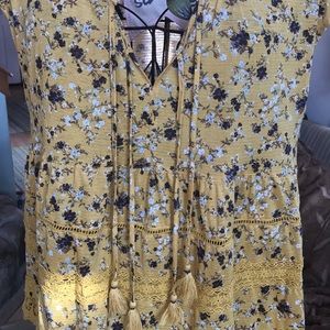 A yellow blouse with floral patterns. Has tassels and lace. Very stylish.