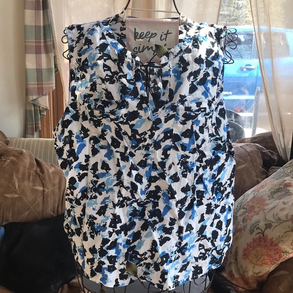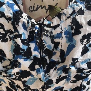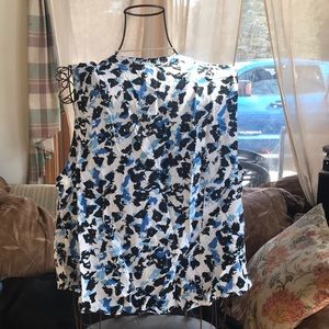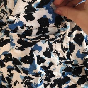 A blue and white blouse with black blotches. No tags but fits a large. Has pockets in the front. Very comfortable.