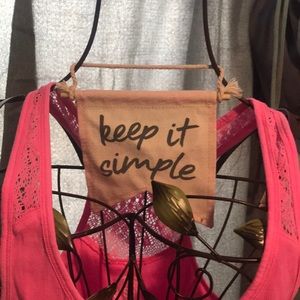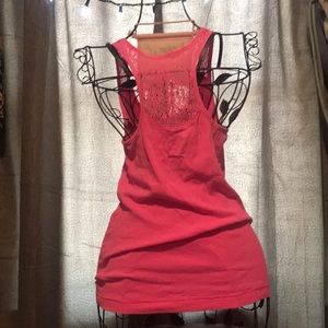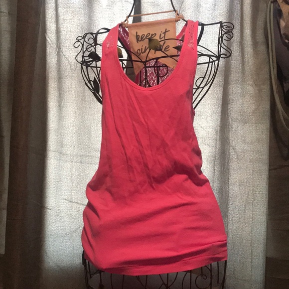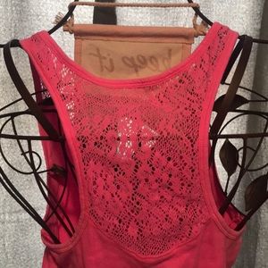 A pink tank top w lace straps and partial lace back. Very cute and bright.