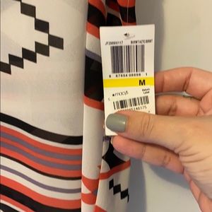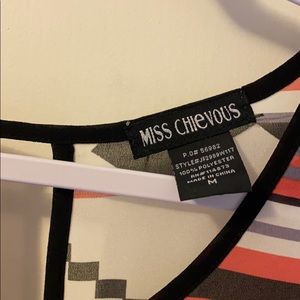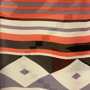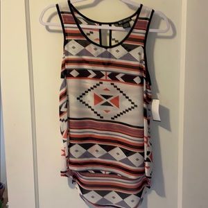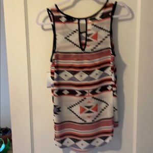 Geometric pattern light flowy tank top, shear. Never been worn, new with tags. Colors are black, white, a purplish blue and salmon-reddish. High-low back. Cute cut out detail in back.