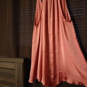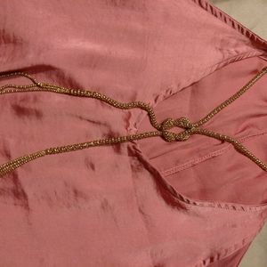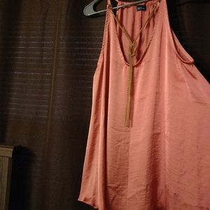 Very beautiful pink color. The necklaces included it comes with the top it clips on but can be unclipped. It is a HAND WASH ONLY item. It is NWOT.it says it's a 1x on the tag but the chest area runs a little small in my opinion. I would definitely not recommend a person with a large bust. It is a satin flowing material and is very a line
