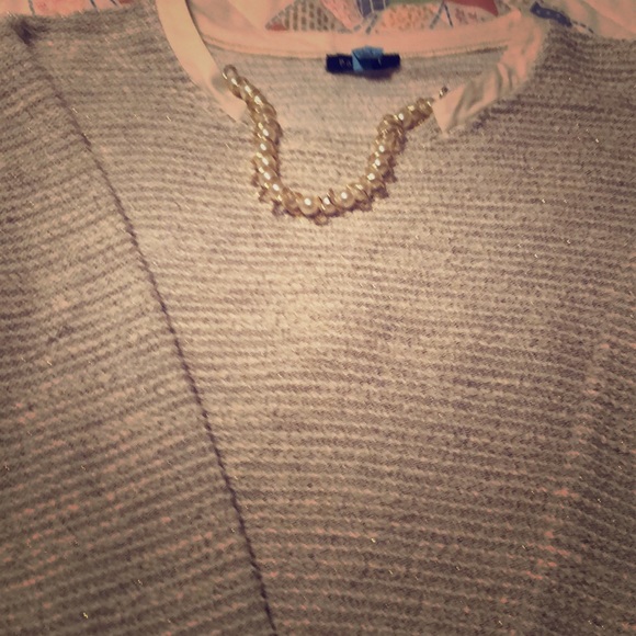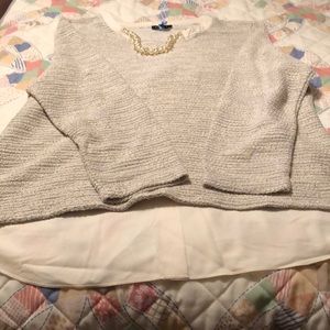 Cream and gold trim with attached necklace. Top is layered with a shirt look at bottom