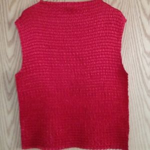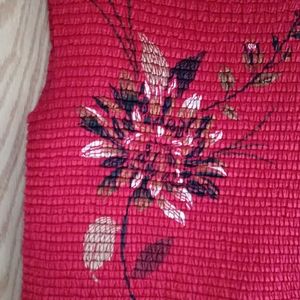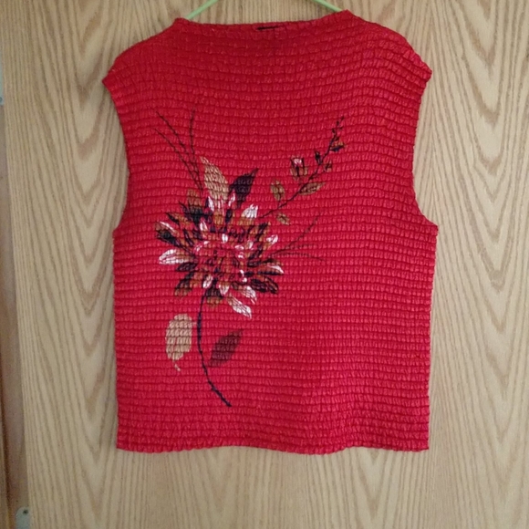 This is a deep red sleeveless polyester crinkle top with a design of a flower on the front very lightweight.
