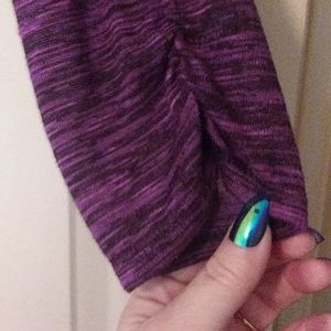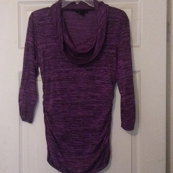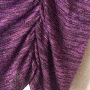 Purple and black top that gathers on each side and the quarter length sleeves it also gather as seen in pictures