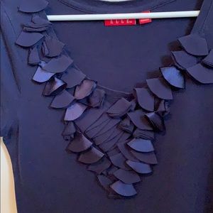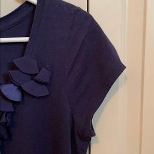 Navy blue top, vneck with petals and ruching. Machine washable and 60% Pima cotton.
