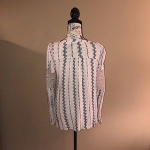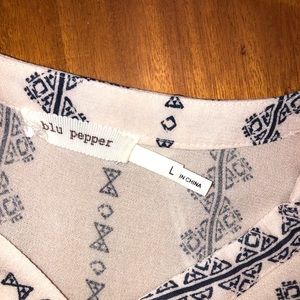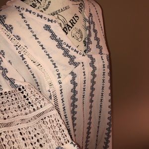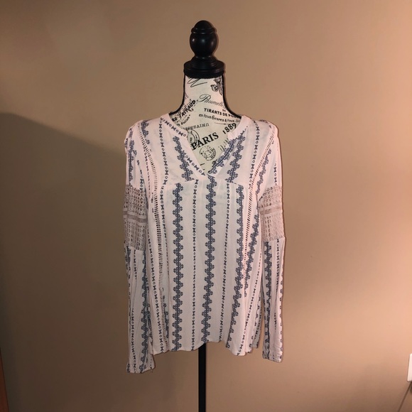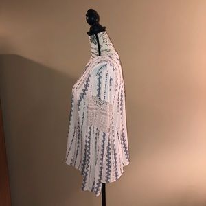 Summer blouse with lace detail. Size L light pink with navy print design.