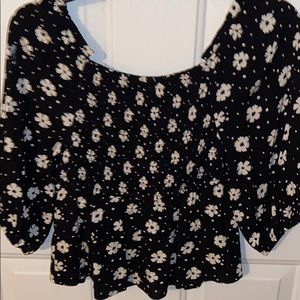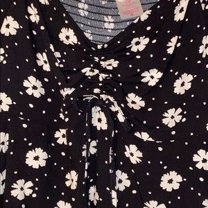 Black with cream flowers shirt .. it’s ruched in the middle with a string tie to loosen or tighten . Never worn bc it’s too low cut for me