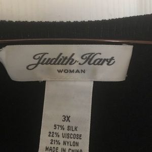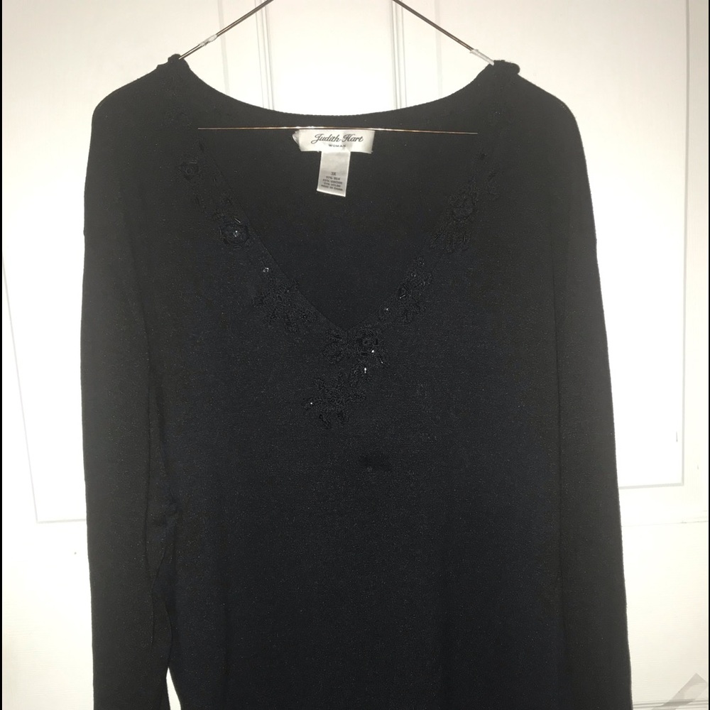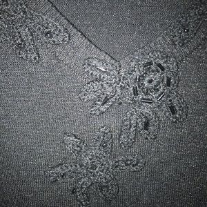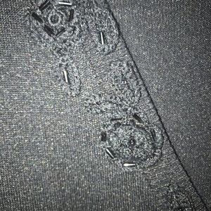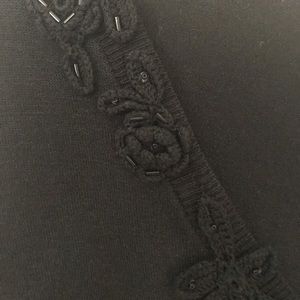 Beautiful black silk top.?Has a gorgeous embellishment around the V-neck in front. Comes from a smoke free/pet free home.