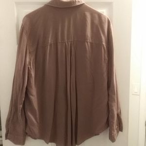 100% rayon silk feel loose fit big pockets in front the color is actually between and brown and maybe a little hint of purple the tags are still on it