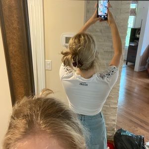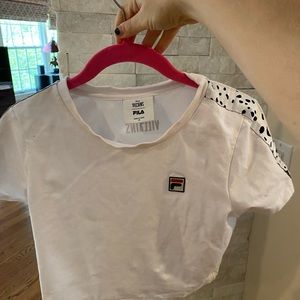 Fila x Disney villains collab. Tight white crop. Sports stretch material