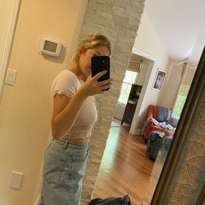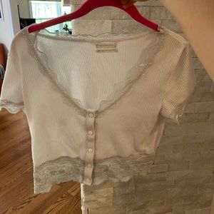 White/cream rubbed crop. Lace around edges with buttons down the middle