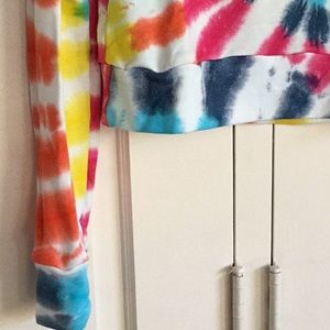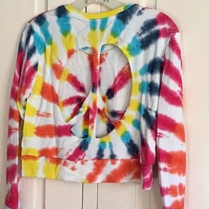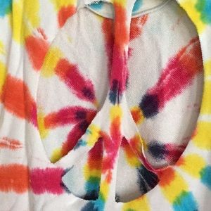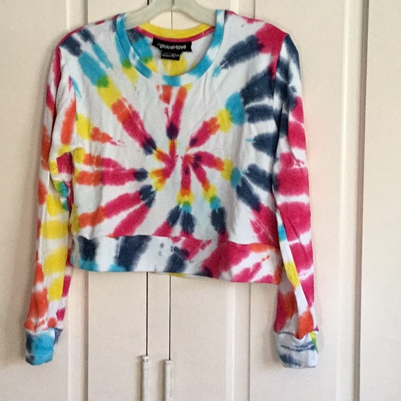 Cropped sweatshirt in child’s size. Very colorful. Long sleeve with cut-out peace symbol on the back. 100% rayon. Hand wash.