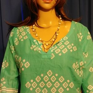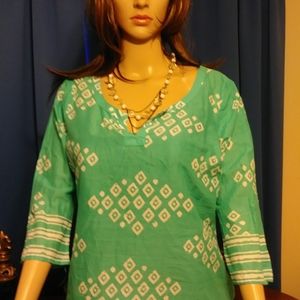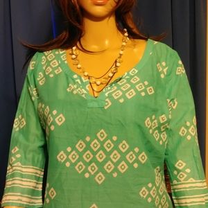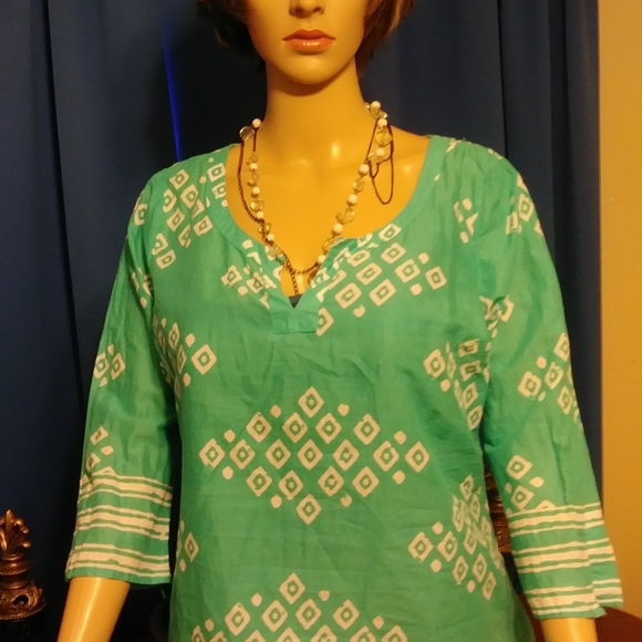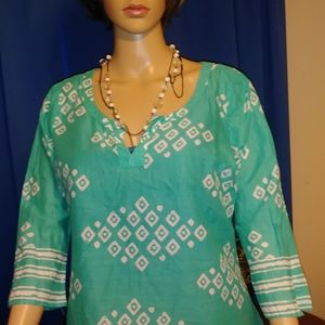 Pretty aqua and white pullover top.Cool and comfortable.Look great with white shorts or pants.Machine washable.