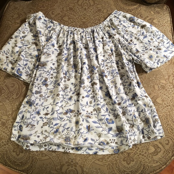 Pretty flower top. Can be worn off the shoulder or in the shoulder. Short sleeves which are flowy. Nice cool top to wear with shorts, skirts or jeans. Fun summer top!