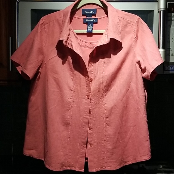 Twin set...salmon colored...sleeveless tank....short sleeve top 8 button down with decorative front panel and back as shown 95% cotton 5% spandex has a linen look