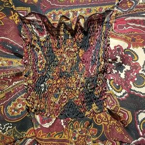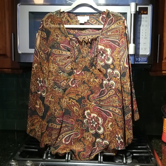 Beautiful Paisley sheer long sleeved but open 1/2 sleeved down. Browns and maroon main colors. 100% polyester