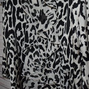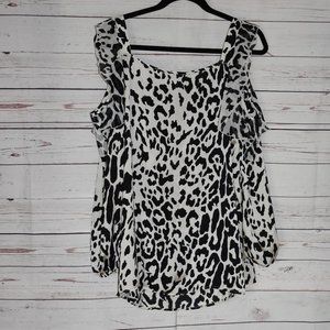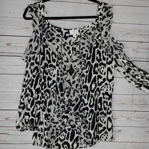 Hot n Hollywood black/cream animal print cold shoulder top. Size XL. Rayon (no stretch). Ruffled front. Long sleeve. Good condition!