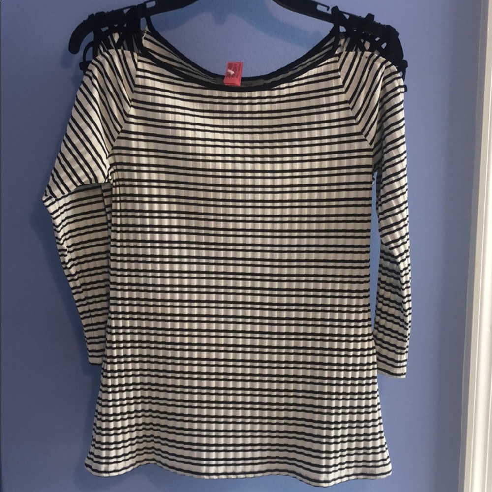And White striped polyester/spandex 3/4 sleeve cold shoulder top. Worn once dry cleaned. Looks brand new