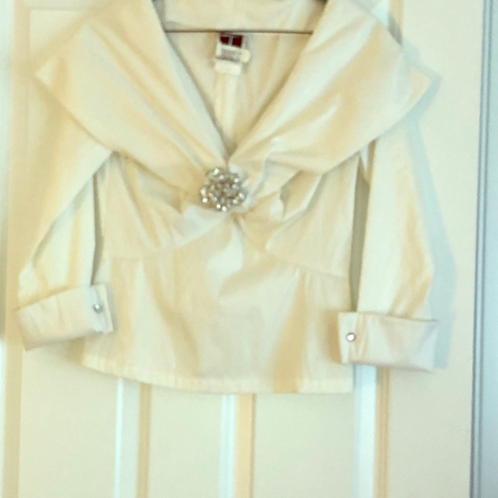 Polyester fancy blouse with 3/4 sleeves and large faux diamond pin at neckline