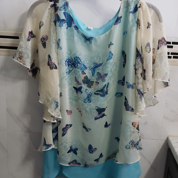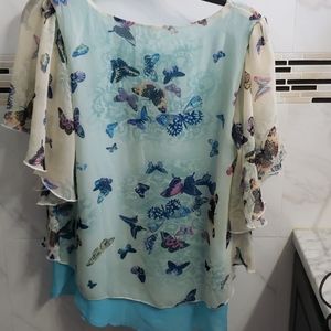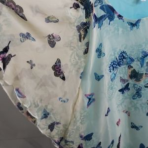NWT silky cute tan and blue top with butterflies and a wide/open sleeve (you can refer in the 2 photo) size M-L