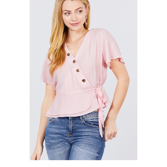 SHORT SLEEVE V-NECK SURPLICE BUTTON DOWN DETAIL RIBBON TIE BACK SHIRRING WOVEN TOP 80% Rayon 20% Nylon