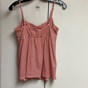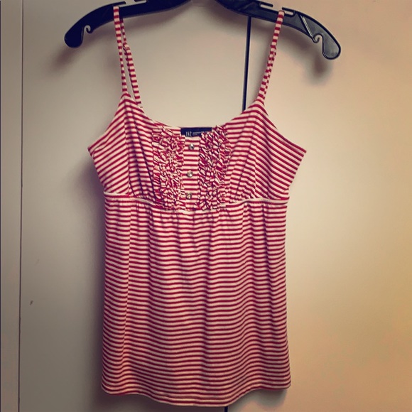 Spaghetti strap CUTE Red Stripe top. 91% rayon 4 % spandex, 5% other fibers . Cute ruffle detail with shiny unique buttons .
