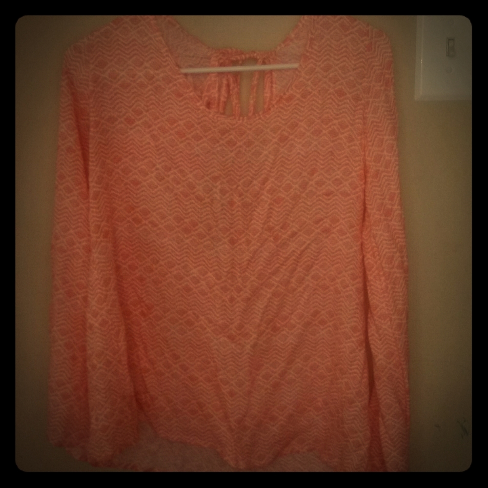 Long sleeve peach and white blouse criss cross and ties in the back s/m