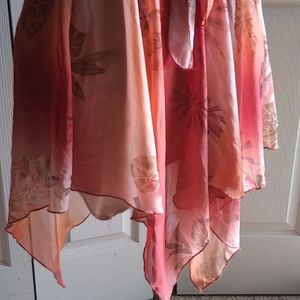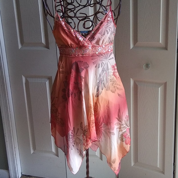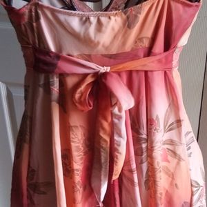Spaghetti straps. large leaf printed. Long Tattered hem. Fully lined & Flows beautifully. Orange & Brown tones. Ties behind with feminine belt. Oh so sweet, yet very sexy.