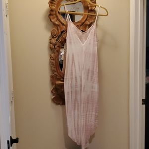 Spaghetti strap top with a long train in the back. Both the front and back are "V'd" and it has sort of a tie die appearance. Cotton and polyester. Its been washed and worn once.