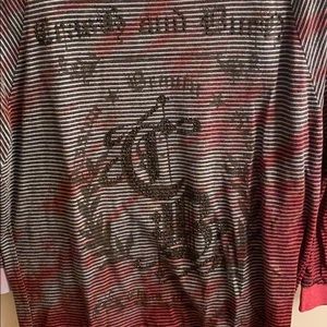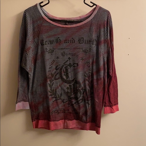 Crash and burn 3/4 length sleeve top. Lightweight, rhinestone detail on the front, shimmer detail on the neckline, sleeve, and bottom band