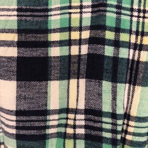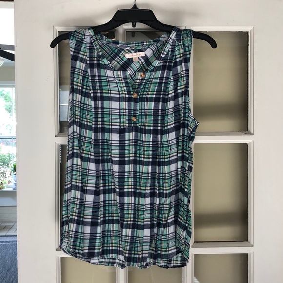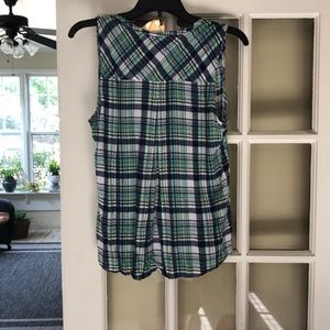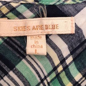 Skies Are Blue sleeveless green, blue, white plaid top. Size large but fits more like a medium. 3 buttons. 100% rayon. Smoke free home.