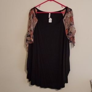 Black polyester top with see thru florsl print sleeves with split and tie on end never been worn.