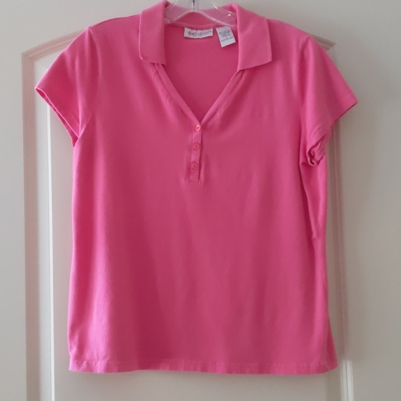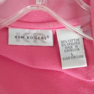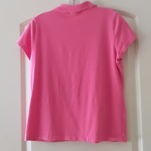 Pink shirt, short, capped sleeves, cotton and spandex. Pet free, smoke free home